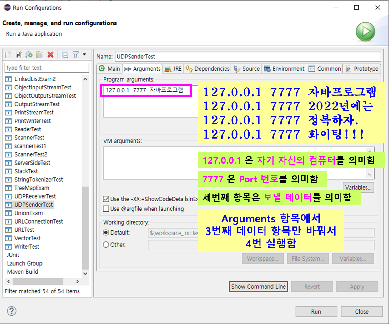 UDPSender 테스트 프로그램에서 사용하는 args[0], args[1], args[2]에 해당하는 아규먼트를 입력해 줍니다.
